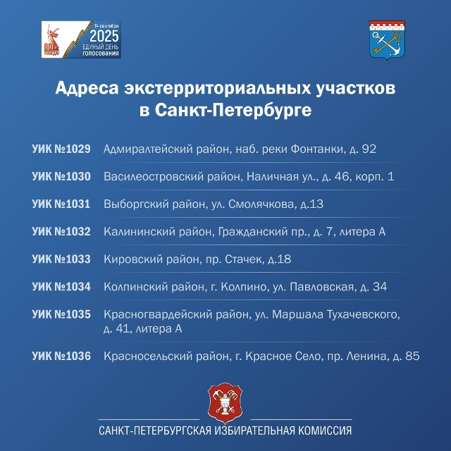 С адресами других экстерриториальных участков можно ознакомиться на странице Избирательной комиссии Ленинградской области по ссылке.