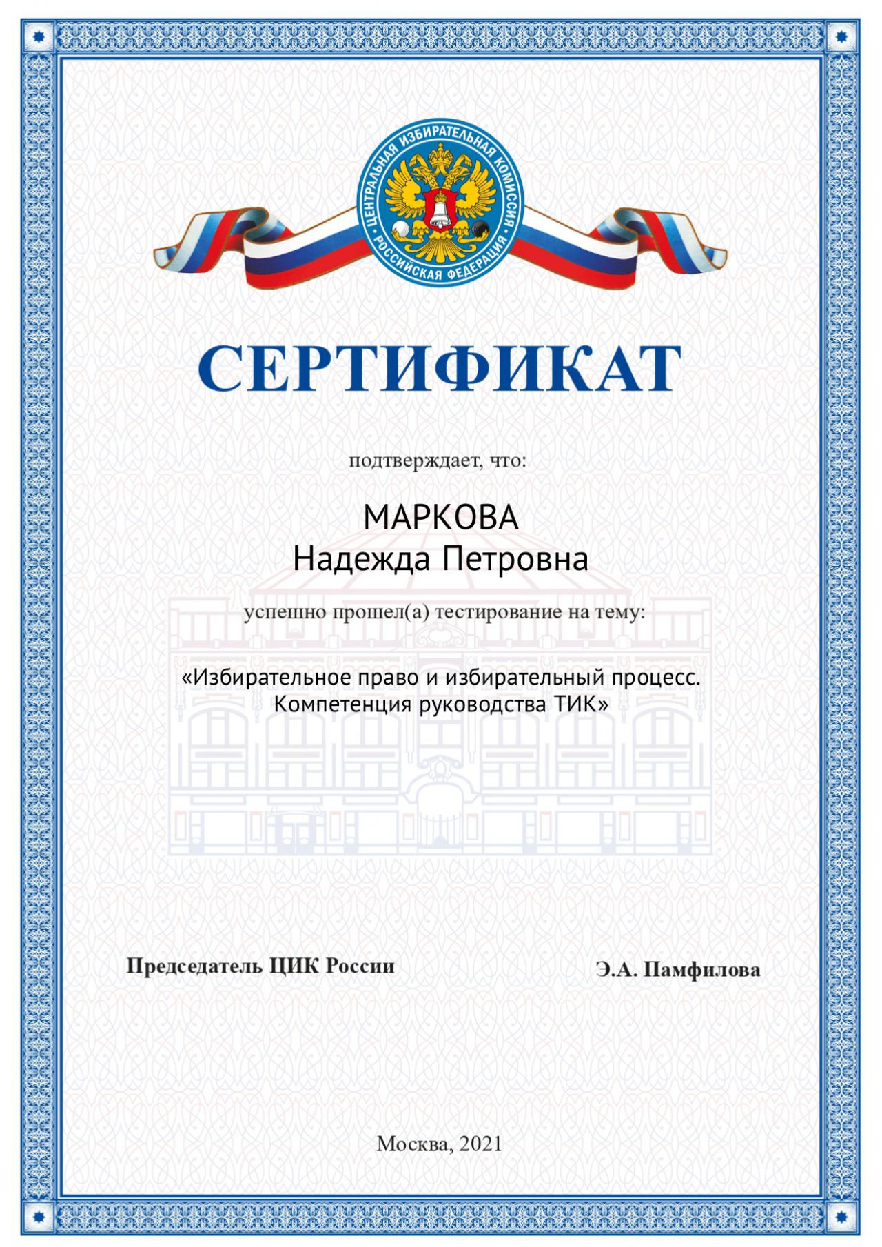 Председатель Территориальной избирательной комиссии №35 Н.П. Маркова успешно прошла тестирование, набрав максимальное количество баллов.